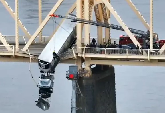 In the shocking picture above from Louisville, Ky, you can see the legs of the trucker dangling from a cable suspended from a crane–just above the cab of the big rig. What’s harder to see are the legs of fire/rescue technician who saved the truck’s operator; his legs are slightly higher and to the right. In order to save the driver, the rescue tech had to subject himself to a great risk. He had to get into a harness, be lowered on a cable that dangled a hundred feet above the Ohio River, putting his own life in jeopardy in the process.